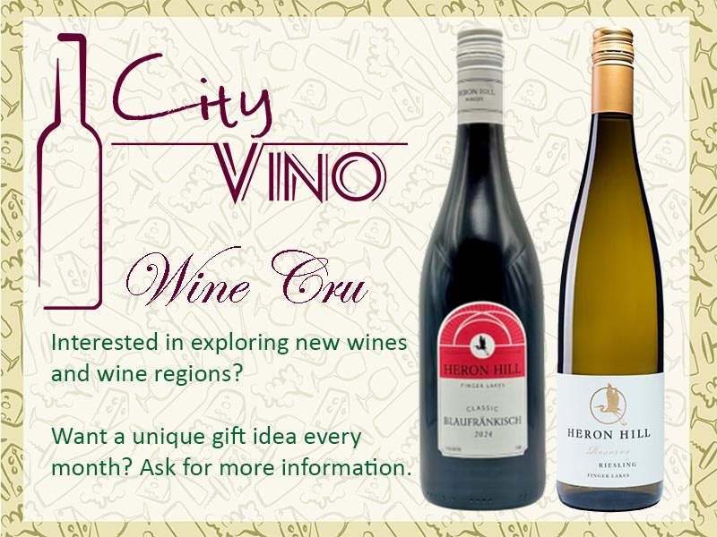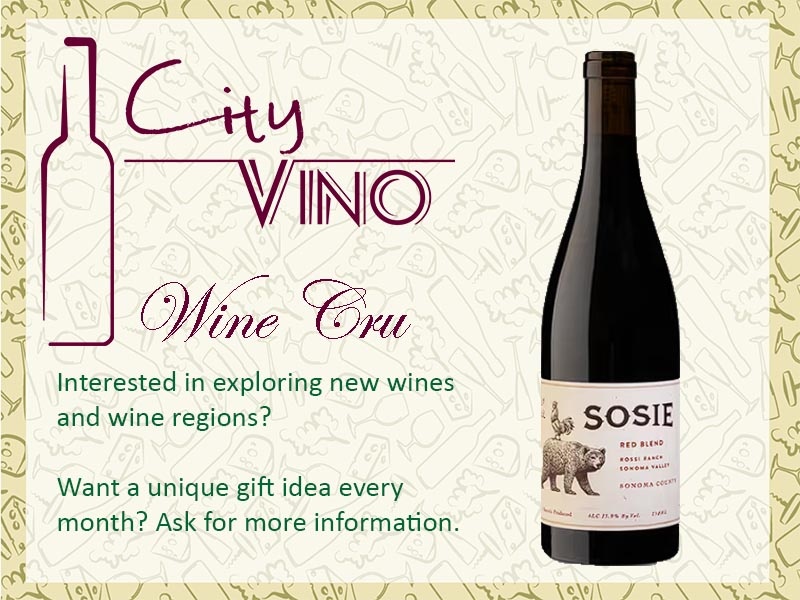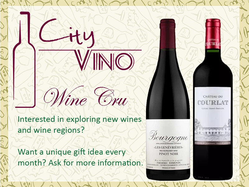 Come join a growing community of wine lovers, followers, and enthusiasts as we explore the fun and fascinating world of wine with the City Vino Wine Cru! From whites to reds and Old World to New World, we will taste, pair, and discover together. Each month City Vino will select one or two outstanding, unique wines, which exceed our high standards to bring this world into your home! $10 initiation fee and $65/month (plus tax)