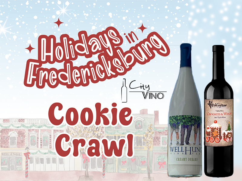 Pick your empty cookie tin at the Fredericksburg Visitor Center at your appointed time. The stroll around to the baker’s dozen businesses to collect your sweet treats and cookies. Enjoy the holiday shopping along the way. Here at City Vino, we will be sampling milk and cookies (Well Hung Creamy Dreams and Bluestone Crooked and Weedy Christmas Cookie Label).